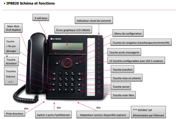 Equipé de 12 touches programmables et d’une prise casque RJ9, le téléphone IP LG-Nortel 8820 intègre de multiples fonctionnalités de gestion d’appels telles que le renvoi d’appel, la mise en attente, le transfert ou encore la conférence à 3.