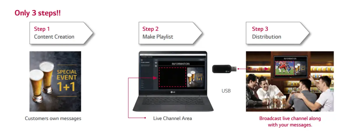 Le processus de création et de lecture de contenu est simplifié pour permettre à l'ensemble des professionnels, même les moins aguerris de diffuser du contenu qualitatif à leur public. LG Simple Editor est particulièrement recommandé pour les petites entreprises (comme les bars sportifs) qui souhaitent réaliser un affichage très simpliste.