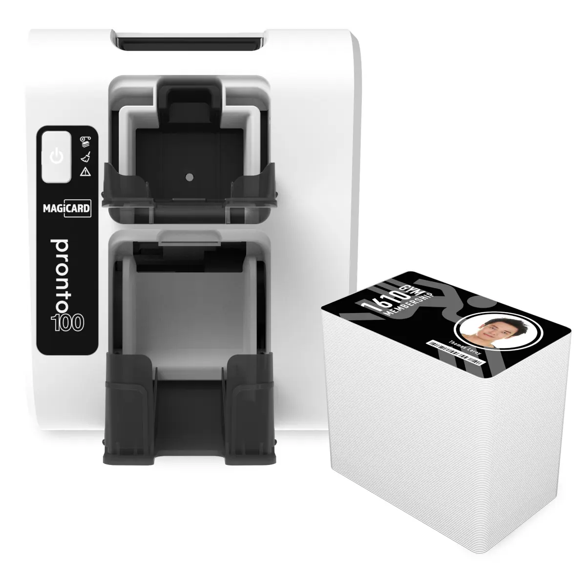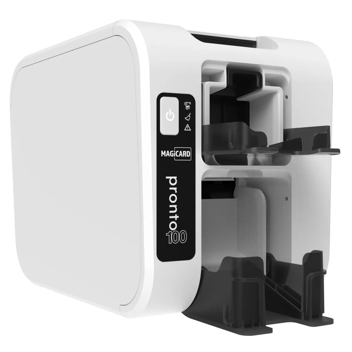 La Magicard Pronto 100 est une imprimante de cartes d'identification conçue pour les structures ayant des besoins de production de cartes modérés. Conçue pour produire des volumes allant de 100 à 3000 cartes par an, ce modèle intermédiaire dans la gamme Magicard. Elle offre rapidité et simplicité d’utilisation tout en combiant des moyens de sécurité visuelle renforcée.