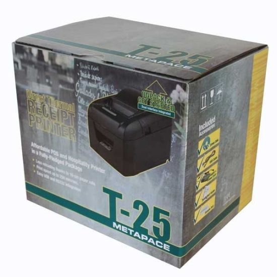 La Metapace T-25 est une imprimante compacte à transfert direct thermique disposant de deux interfaces (USB et RS232) et d'un port RJ11 afin d'y connecter un tiroir-caisse.
