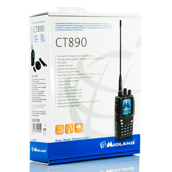Proposant un grand afficheur LCD couleur et une antenne flexible, le CT890 de Midland est livré en pack avec une batterie haute performance Li‐Ion de 2600mAh.