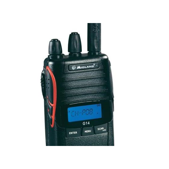 D'une taille equivalente à un paquet de cigarettes, le midland G14 dispose d'une antenne souple longue portée de 160mm, ce qui, au total, amène le produit à une longueur d'à peine 26cm et en fait ainsi un des talkies les plus portatifs et discrets du marché.