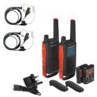 Le pack Motorola T82 proposé ici est composé de 2 talkies walkies T82, un dock de chargement, une alimentation 220 volts, 2 batteries Nimh, 2 clips ceinture et 2 oreillettes en tube transparent type "bodyguard".