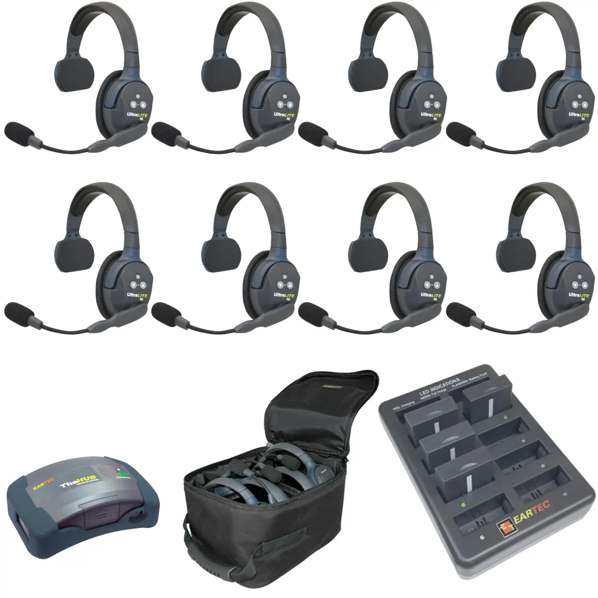 Le pack de 8 Eartec UltraLITE HD est un pack composé de 8 casques intercom Eartec UltraLite HD Mono Esclaves et d'un Hub. Ce pack a pour objectif de vous faire converser à plusieurs sans interruption grâce à ses fonctions intercom. Doté de la technologie DECT, ces casques intercom sont Full Duplex pour vous permettre de converser sans avoir la nécessite d'appuyer sur un bouton PTT.