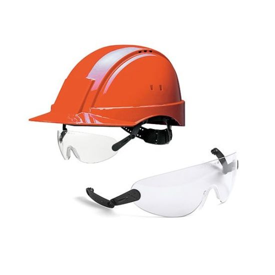 Casque de chantier avec lunettes et protection auditive.