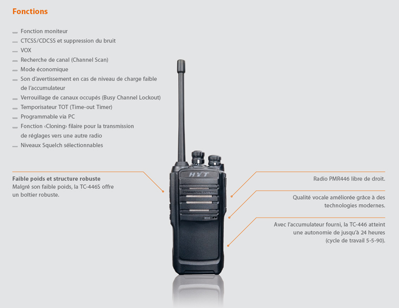 Le HYT TC446S est un émetteur récepteur PMR446S (Fréquences Libres) professionnel et Polyvalent. Nouveauté de la gamme HYT, il permet d'accéder à un talkie walkie haut de gamme comparable à la gamme xtn de Motorola pour un prix inférieur à 130 euros.