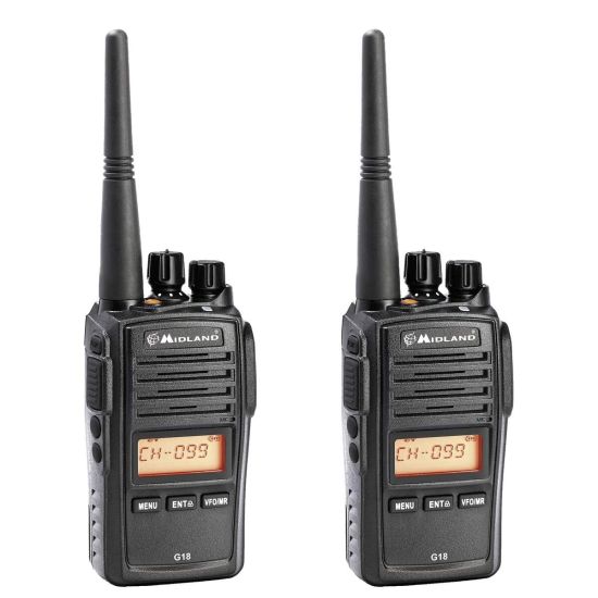 Le pack de 2 Midland G18 Pro est composé de 2 talkies-walkies G18 de la marque Midland ainsi que les accessoires d'origine tels que 2 batteries Li-Ion de 1600 mAh avec socles de charge, 2 clips ceinture ainsi que 2 adaptateurs muraux. Les émetteurs-récepteurs semi-professionnels Midland G18 sont idéaux pour une utilisation dans les environnements les plus complexes. Polyvalent et fiable, il offrira des communications claires même dans les endroits bruyants.