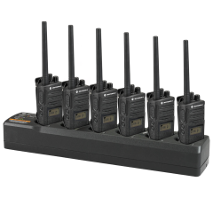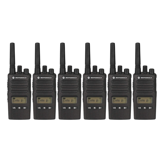 Le pack de 6 Motorola XT460 comprend 6 talkies-walkies analogiques sans licence avec écran, conçus pour une utilisation professionnelle, ainsi que 6 batteries Li-Ion de 2150 mAh, offrant jusqu'à 20 heures d’autonomie pour une journée complète de communication. Chaque appareil est accompagné de son propre socle de charge individuel avec alimentation, permettant une recharge facile et rapide. Le pack inclut également 6 étuis clips ceinture pour un port sécurisé et pratique, à la ceinture ou en poche, facilitant l'accès en toute situation.