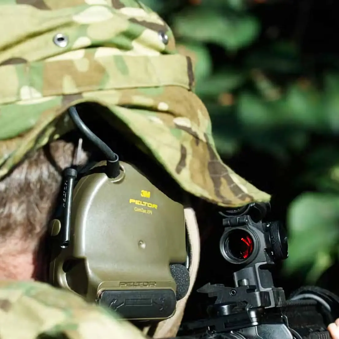 Le casque antibruit 3M Peltor ComTac XPI est robuste, il répond lors des phases de test aux normes militaires et est équipé d'un cordon J11 permettant d'y relier un talkie walkie.