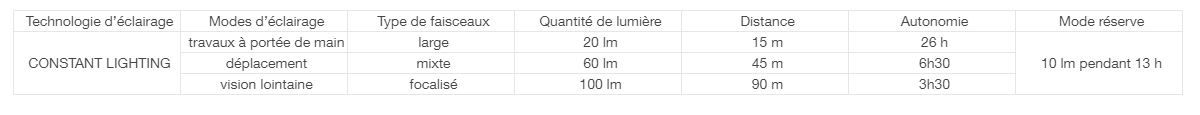 3 types de faisceaux accompagne l'ouvrier en milieux sombres : large, mixte et concentré pour voir plus loin. La technologie Constant Lighting breveté par Petzl fournit une lumière de qualité sans faiblissement pendant toute durée d'utilisation même en mode réserve (la lampe continue d'éclairer à plus faible intensité pour préserver au moins 13h d'illumination.
