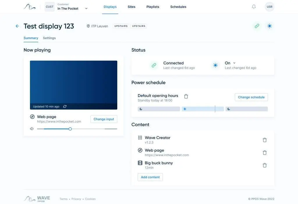 Philips Wave Controller Essential a été étudié pour gérer de façon efficace vos écrans professionnels Philips avec Android intégré . Grâce à cette plateforme de gestion d'affichage basée sur le cloud, vous pouvez contrôler à distance vos écrans pros via un unique emplacement. Elle vous permet d'avoir une vision globale en ouvrant simplement une page web. Qu'importe où vous vous trouvez, gardez un œil sur ce qui est diffusé en temps réel sur vos différents sites et anticipez les pannes éventuelles. Vous n'avez aujourd'hui plus besoin de vous déplacer pour vérifier que tout fonctionne correctement.