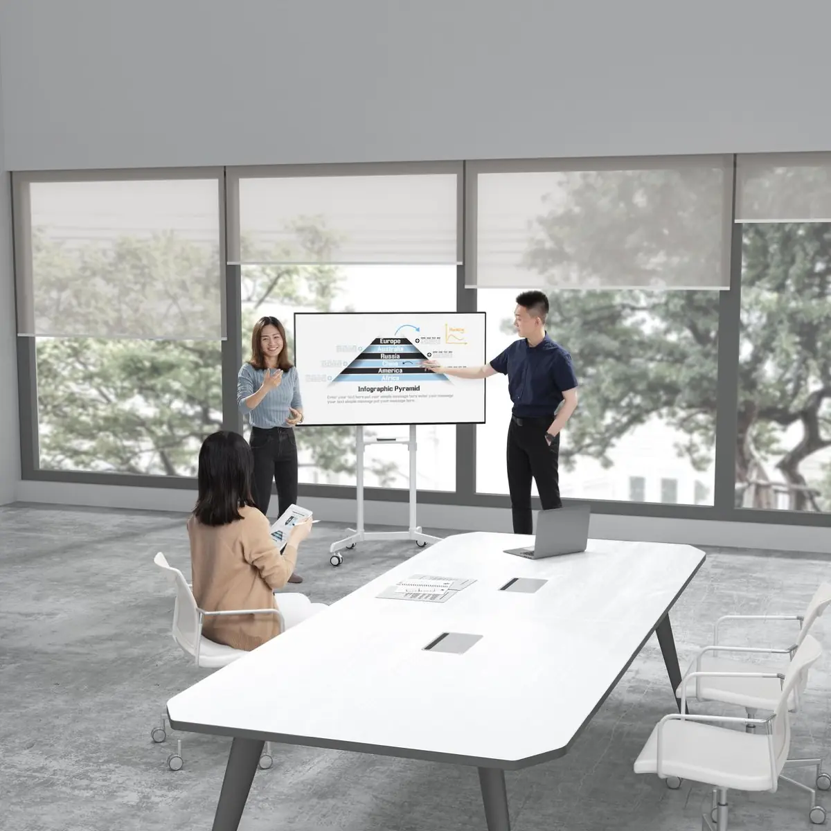 Écran tactile interactif avec support rotatif. L'écran reste pivotable du mode paysage au mode portrait. Encombrement au sol très faible.