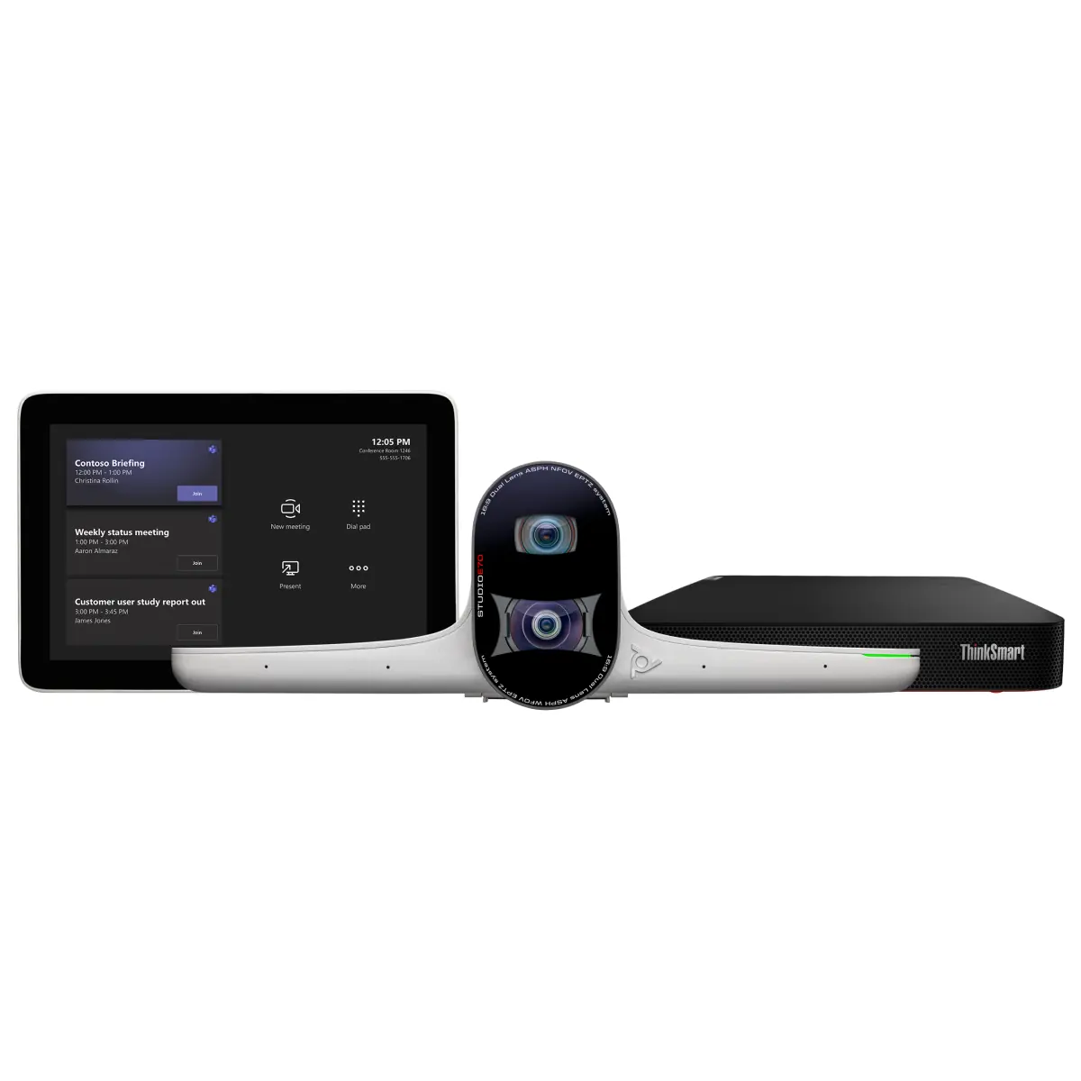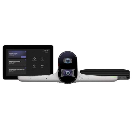 Étudié pour les grandes et très grandes salles, ce kit n'inclut pas de système audio. En fonction des spécificités de votre salle et de vos besoins, vous pouvez le compléter avec des micros plafonds, ou des speakerphones, comme le Poly Sync 60