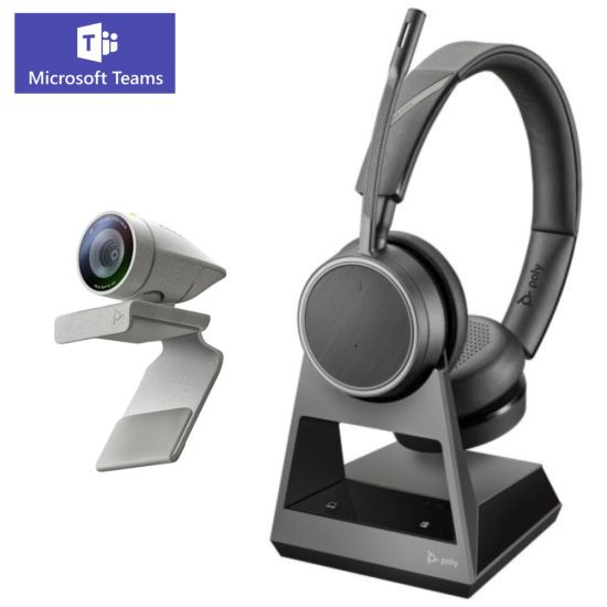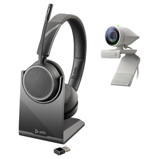Avec une caméra USB Poly Studio P5 et un casque stéréo sans fil Voyager 4220 UC, vous suivez vos réunions tout en offrant une qualité d'image et de son exceptionnelle. Facile à brancher, la caméra a une connexion USB et le casque sans fil se connecte en Bluetooth et via USB grâce au dongle fournit.