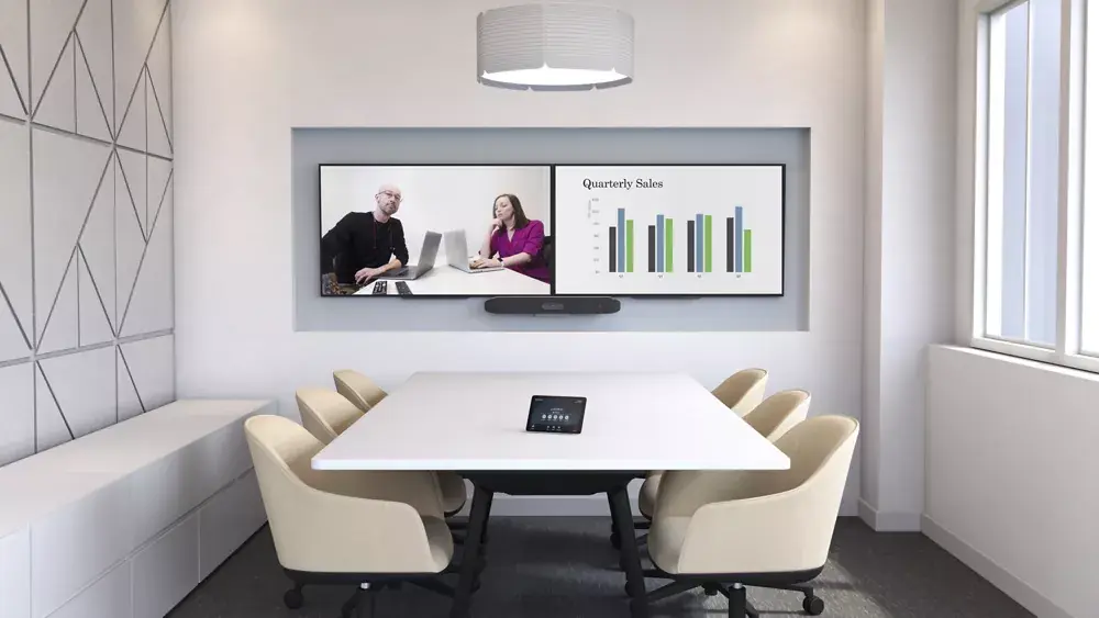 La rapidité d'installation se traduit par un outil clé en main : la caméra n'a pas besoin d'être branchée à un ordinateur pour fonctionner. La barre de visioconférence Poly Studio X50 intègre nativement l'application Zoom, Google Meet et Microsoft Teams pour conférence audio-vidéo. Ainsi, avec un abonnement pour salle de réunion Microsoft Teams Rooms, Zoom Rooms ou Google Meet Rooms, votre équipement devient autonome. Les réunions s'affichent directement sur l'écran de votre salle. Il suffit de la sélectionner pour la rejoindre.
