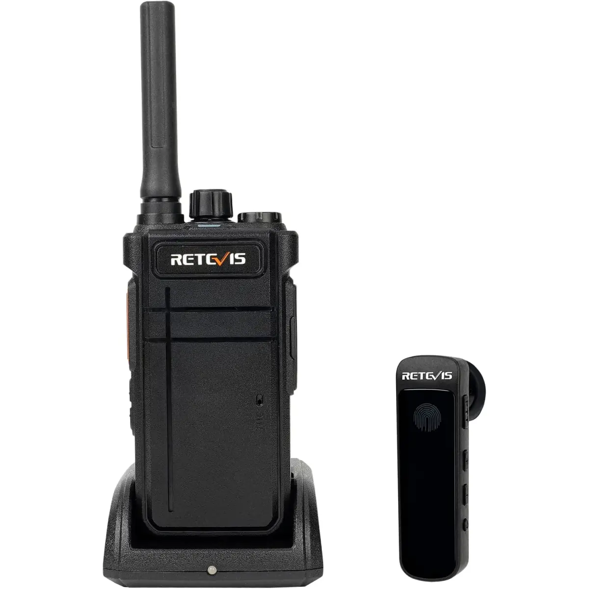 Livré avec son socle de charge et son câble USB-C, le talkie-walkie Retevis RB637 2.0 et l'oreillette Bluetooth possèdent un port USB-C afin de les recharger.