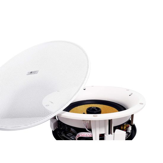 L'intégration dans le plafond est discrète avec un diamètre d'encastrement de ∅ 245 mm et une grille plate aimantée en métal. Les câbles HP sont inclus. Les haut-parleurs, reliés, forment une paire stéréo fonctionnant uniquement ensemble. Le kit est livré avec une télécommande, un adaptateur secteur et deux câbles haut-parleurs pour une installation complète.