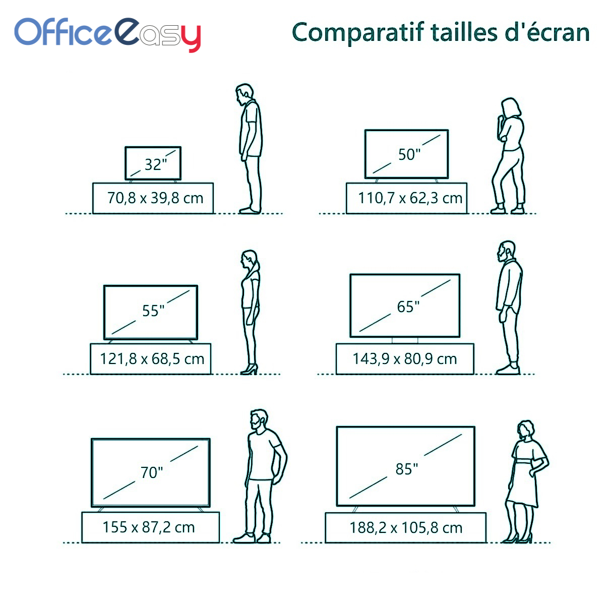 Si dans une Huddle room un écran de taille 32 pouces peut suffire, il est de moins en moins rare de s'équiper d'écrans TV de grande taille, allant pour certains jusque 85 pouces (+ de 2 mètres). Plus faciles à installer et plus réactifs que les video projecteurs, les écrans TV d'affichage dynamique professionnels ont ces dernières années totalement supplanté les vidéoprojecteurs en entreprise.