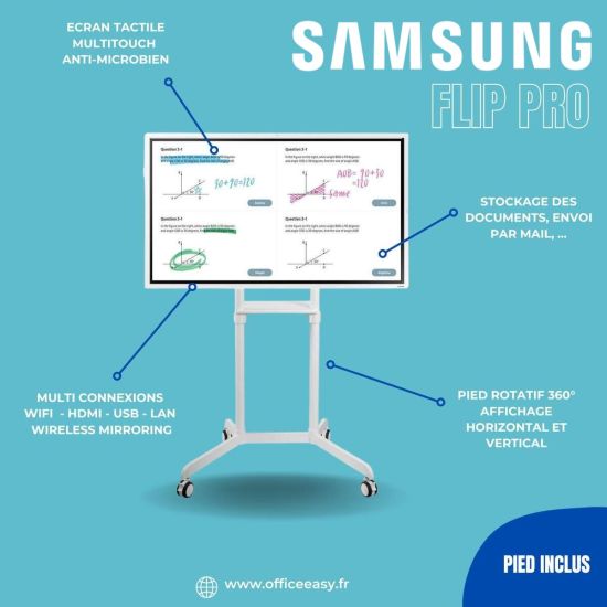 - Samsung Flip Pro 65 pouces avec Pied rotatif mode portrait. L’aspect visuel du support peut varier selon les disponibilités. Pour toute demande spécifique (hauteur du pied, base à faible encombrement, etc.), merci de contacter notre service commercial.