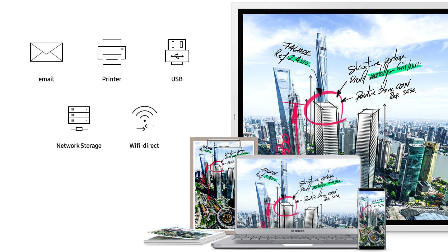 La fonction partage d'écran vous permet de partager du contenu en temps réel, ainsi toutes les modifications apportées sur le Samsung Flip 65" seront reflétées sur les périphériques connectés pour une collaboration efficace. De plus, vous pouvez facilement partager le compte-rendu de la réunion supprimant ainsi les prises de notes.