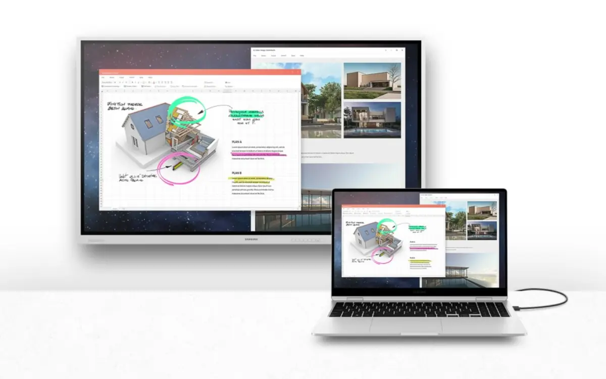 Ce modèle Samsung se différencie néanmoins des autres qui fonctionnent sur le système d’exploitation Tizen OS. En effet, l’écran s’appuie ici sur Android. Cette nouveauté permet notamment d'offrir une interface utilisateur plus intuitive depuis laquelle les utilisateurs pourront personnaliser leur écran d’accueil. Elle offre aussi l’opportunité aux personnes d'utiliser des applications, directement intégrées sur l'écran (ScrenShare notamment). D’autres outils peuvent être utilisés en complément pour faire contribuer les équipes et rendre les réunions plus interactives : minuteur, enregistrement de l'écran, etc.