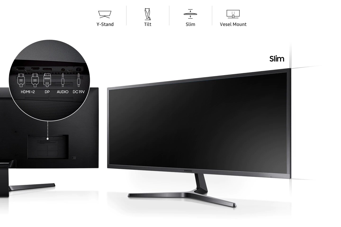 Le panneau du S34J550 est fin, et son pied élégant en Y ainsi que son cadre métallique apportent une touche de style à votre bureau. Le VESA (100 x 100) facilite le montage de l'écran. Les ports Display port et HDMI permettent une connectivité multiple.
