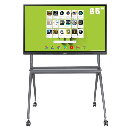 Kit avec écran interactif Samsung 65 pouces et support roulant réglable en hauteur. Ecran avec Android et applications Google intégrées.