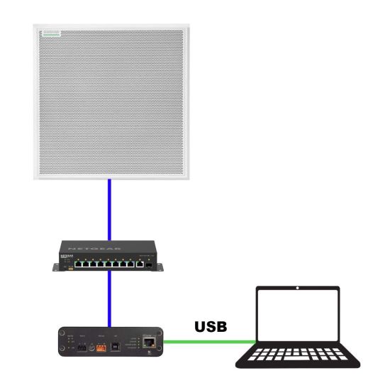 En effet, le micro plafond MXA902 et l'interface ANIUSB-MATRIX sont alimentés en PoE. De ce fait, l'alimentation, les signaux audio et de contrôle sont transmis via un seul et même câble RJ45.