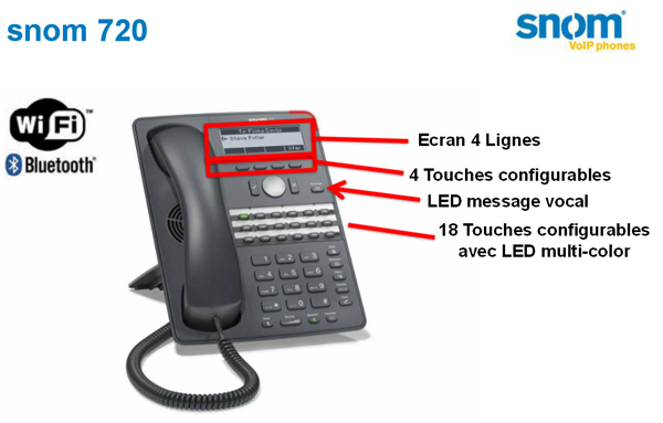 Téléphone IP SIP Snom 720 : écran 4 lignes, audio haut débit, 12 comptes SIP.