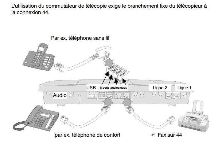 - Le fax est raccordé sur l’extension 44. Le détecteur de fax dirige les appels fax entrants depuis la ligne 1 vers cette extension
