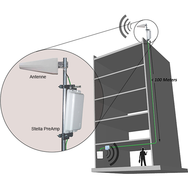Il est possible d'utiliser jusqu'à 100 mètres de câble entre l’antenne et le répéteur sans aucune perte de signal. Le Préamp est donc efficace pour les très grandes surfaces à installer telles que les hôtels, les hôpitaux, les immeubles de bureaux, les restaurants, les aéroports, les centres commerciaux.
