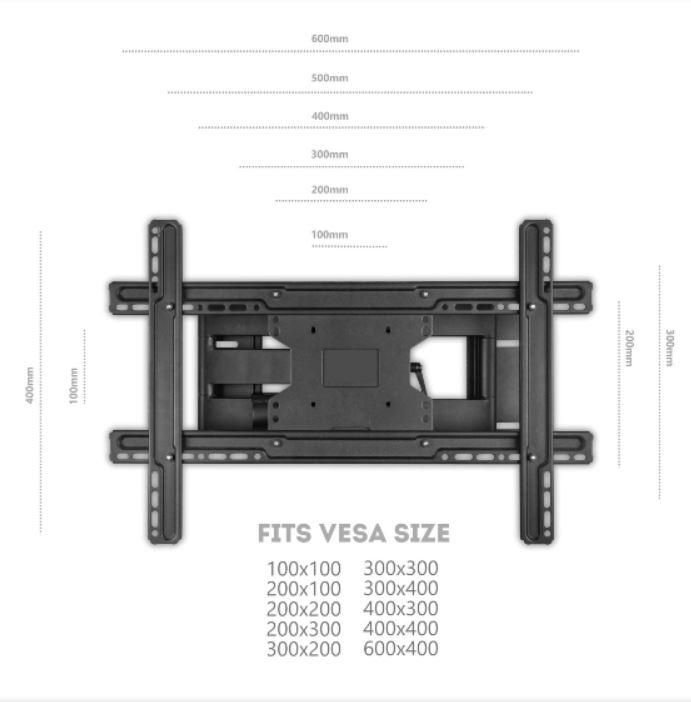 - Vesa 100 X 100 ; 100 X 200 ; 200 X 100 ; 200 X 200 ; 200 X 300 ; 200 X 400 ; 300 X 100 ; 300 X 200 ; 300 X 300 ; 300 X 400 ; 400 X 200 ; 400 X 300 ; 400 X 400 ; 500 X 400 ; 500 X 400 ; 600 X 200 ; 600 X 300 ; 600 X 400 mm