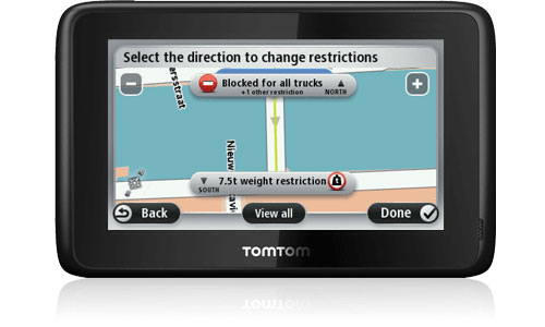 Une fois le gabarit saisi dans l'interface utilisateur, le TomTom Pro 7100 calcule l'itinéraire le plus rapide en prenant en compte les restrictions de largeur, de hauteur, de longueur et de poids liées à votre véhicule.