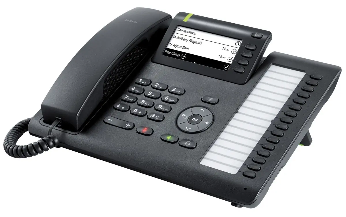 Téléphone sous protocole SIP de milieu de gamme, l'Openscape CP400 de Unify dispose de nombreuses touches programmables avec LED dédiées, ainsi que d'une qualité audio HQ, avec touche muet, haut parleur et prise casque.