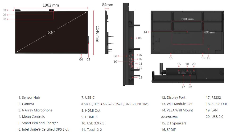 - Ecran tactile 86” (218 cm) UHD 4K