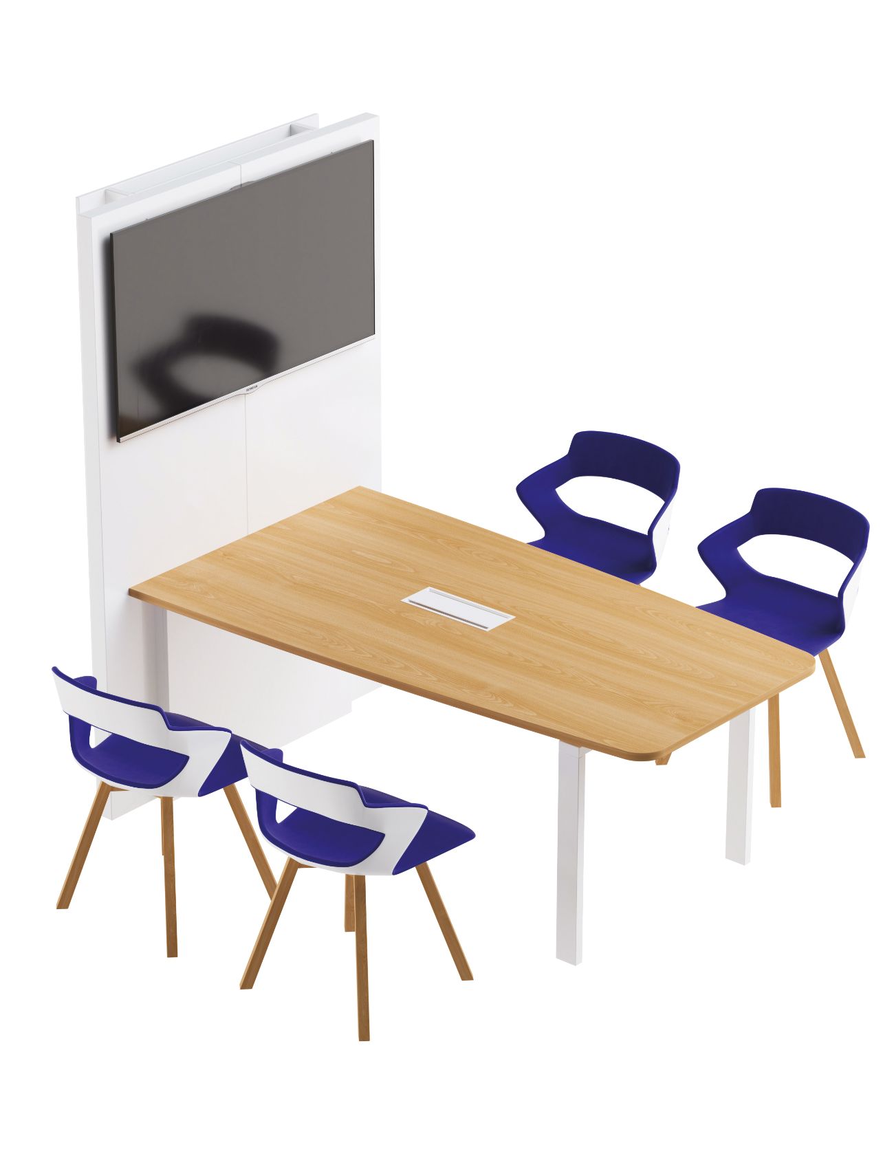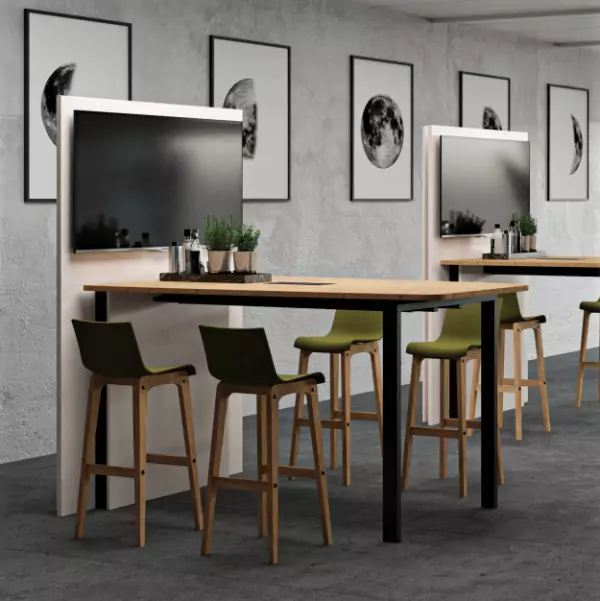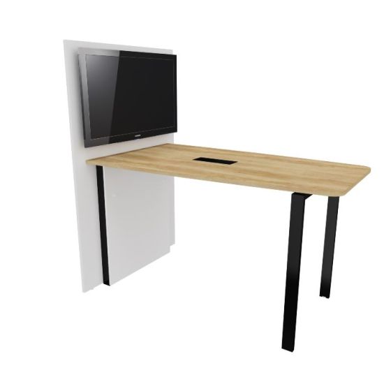La table de réunion Buronomic Visio Hub a été conçue de manière à intégrer un écran, jusqu'à 50 pouces, destiné à projeter vos présentations ou vos visioconférences. Cette table haute ajoute une touche design à vos bureaux tout en masquant l'ensemble des câbles nécessaires au fonctionnement de l'écran, caméras de visioconférence et de vos PC.