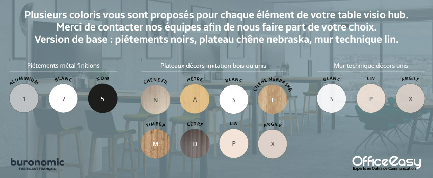 De fabrication française, les meubles Buronomic sont des mobiliers pour salle de réunion fabriqués en mélaminé Structurex® d'une épaisseur de 25 mm assurant stabilité et résistance. Le modèle qui vous est proposé par OfficeEasy se dote d'un plateau de 140 cm au coloris Chêne Nebraska avec trappe centrale, de pieds en métal noir finition époxy laqué et d'un mur technique blanc équipé d'inserts pour assurer la fixation du support d'écran (non fourni).