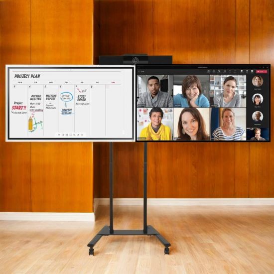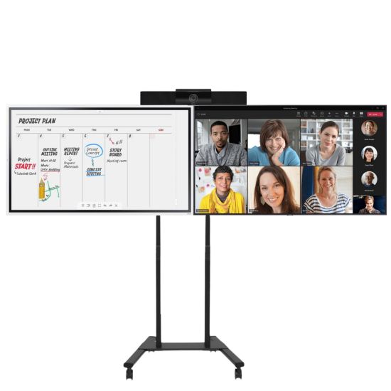 Kit de visioconférence avec 1 écran interactif, 1 écran passif, une barre de visioconférence Poly Studio USB et un pied roulant double écran motorisé. Existe en 3 tailles.
