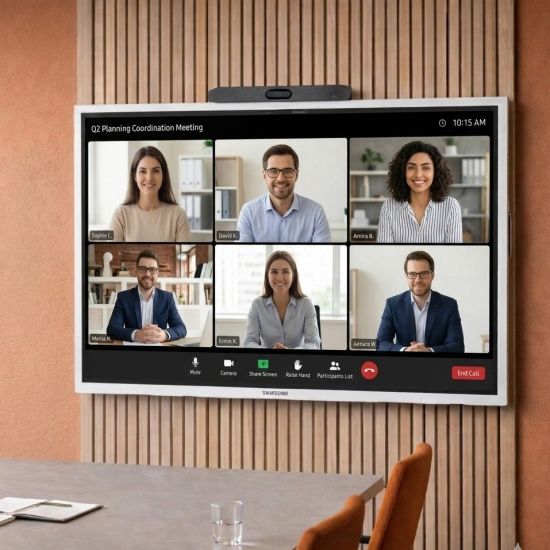 La Poly Studio V12 est certifiée Microsoft Teams. Elle peut être utilisée en mode BYOD USB depuis n'importe quel PC Teams, ou intégrée à un système Teams Rooms sur Windows pour une gestion centralisée via Poly Lens Cloud — mises à jour, diagnostics et réglages à distance sans déplacement sur site. Le Samsung Flip Pro prend également en charge Samsung Workspace pour l'accès à des ressources distantes depuis l'écran.