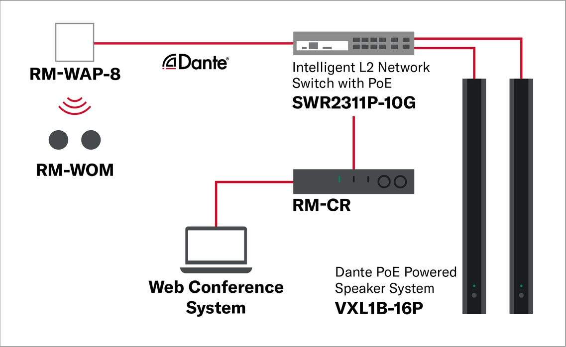 Pour simplifier l'installation, le point d'accès utilise une alimentation PoE et fonctionne grâce au réseau audio Dante. De ce fait, l'alimentation, les signaux audio et de contrôle s'effectuent via un seul et même câble réseau. En effet, le point d'accès est relié à un switch PoE. Le switch est connecté au processeur audio RM-CR . Le tout avec un câblage RJ45. Il ne vous reste plus qu'à brancher votre ordinateur en USB sur le processeur pour récupérer tous les périphériques audio du système. L'assistant de configuration Web vous permettra d'appairer les microphones et d'effectuer la configuration sans aucune difficulté.
