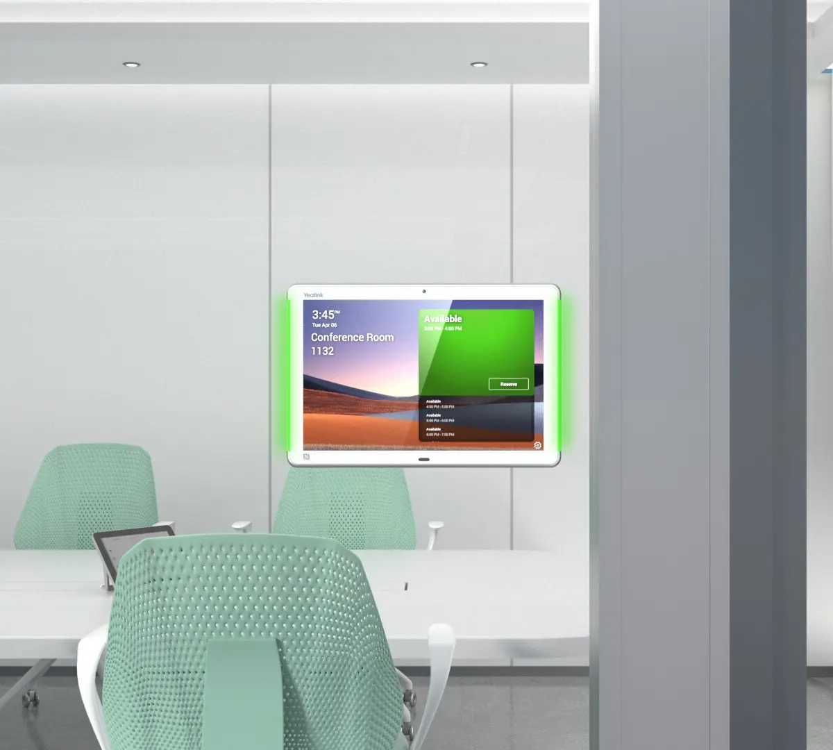 Le Yealink RoomPanel Plus Teams est un écran tactile, avec un design blanc, à installer à l'extérieur des salles de réunion. Cette solution, certifiée Microsoft Teams, permet d'afficher les réunions programmées via les applications de calendrier Teams. En un coup d'œil, les collaborateurs sont informés de l'agenda du jour. Grâce à son interface intuitive, la tablette peut également être utilisée de manière spontanée. Réservez un créneau libre directement depuis l'écran tactile !