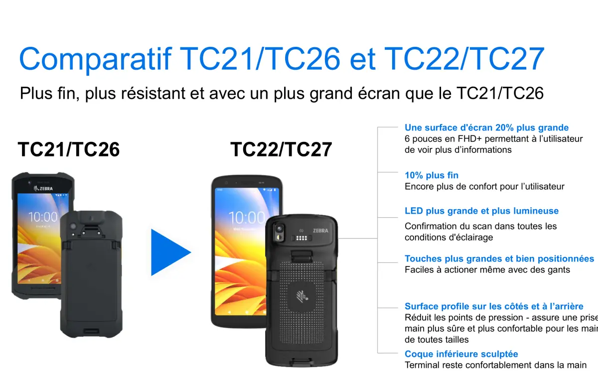• Possède un écran 20 % plus grand : 5 pouces pour le TC21 et 6 pouces pour le TC22